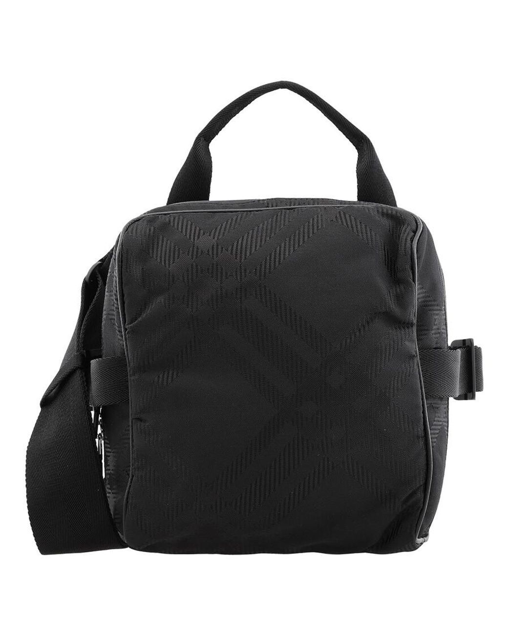 Burberry Mens Crossbody. SKU: 8080900. Barcode: 5045704982387. Color: Black. Size: 22 x 11 x 20 cm. Burberry Check Jacquard Crossbody Bag. This bag features a check pattern, top zip fastening, single top handle and two adjustable shoulder straps. 78% Polyamide. 22% Polyester. Colour: black