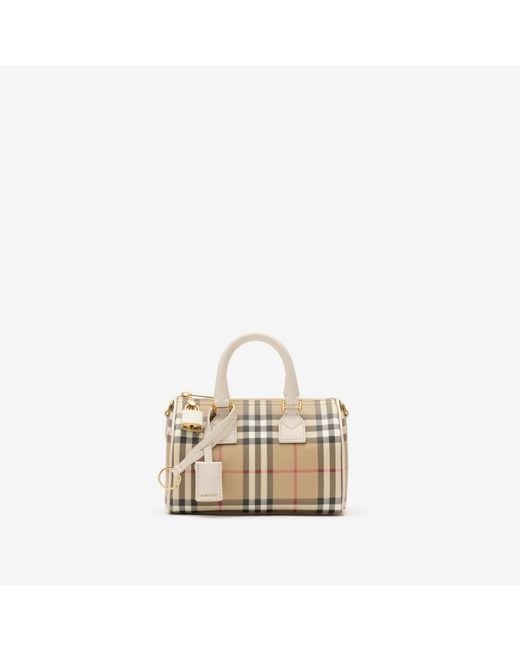 A compact bowling bag made in Italy from a coated cotton blend printed with the Burberry Check and lined in cotton. The compact design is trimmed in smooth calf leather and features a leather-wrapped padlock and key. A detachable strap switches the style to a shoulder bag. Rolled leather top handles Detachable, adjustable leather strap Zip closure Hand-painted edges Polished metal hardware Leather-wrapped padlock and key Cotton lining Comes with a dust bag 18.5 x 11 x 12cm/7.3 x 4.3 x 4.7in Min. strap drop: 47.5cm/18.7in Max. strap drop: 52.5cm/20.7in Outer: 48% cotton, 38% polyurethane, 14% polyester Trim: 100% calf leather Lining: 100% cotton Made in Italy Colour: natural