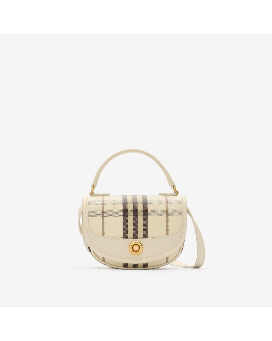 Rooted in the outdoors, the mini Highlands bag is made in Italy from a cotton linen blend trimmed with smooth calf leather and lined in cotton. The fabric is jacquard-woven with the Burberry Check and has a coated finish inspired by rainwear. Carry by the top handle or adjust the strap to wear on the shoulder or as a crossbody. Leather top handle Adjustable leather strap Magnetic push-button closure Two card slots Interior slip pocket Hand-painted edges Brushed metal hardware Engraved Burberry lettering at closure Cotton lining Comes with a dust bag Colour: natural