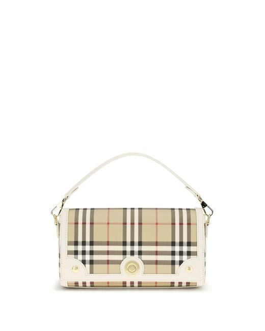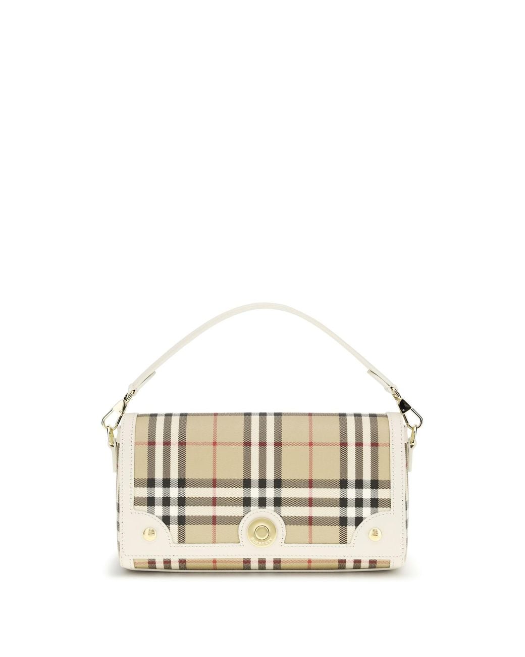 The note shoulder bag by burberry combines timeless elegance with contemporary versatility. featuring a detachable leather top handle and an adjustable webbing shoulder strap, it offers multiple ways to wear it. the fold-over top flap with a magnetic closure and the internal pouch pocket ensure practicality, while the hand-painted edges and polished metal hardware add a touch of artisanal refinement. Composition: 55% % Thermoplastic Polyurethane, 20% % Cotton, 25% % Polyester Colour: metallic