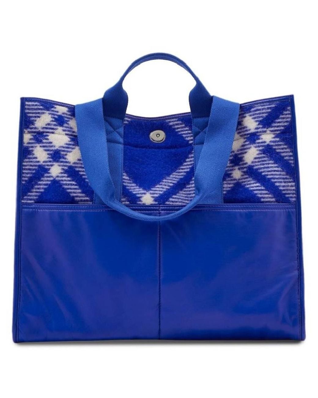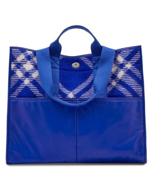 Burberry Mens Tote. SKU: 8075132. Color: Knight. Size: 16.3 x 6.3 x 14in. Burberry Check Jacquard Woven Shopper Tote. A softly structured tote, expertly crafted in Italy from brushed wool and jacquard woven with a seasonal check. The boxy silhouette is accented with smooth calf leather pockets at the front, press stud closure, and 2 exterior pockets. Short handle drop: 3.2. Long handle drop: 10.4. Outer: 99% wool, 1% polyamide. Made in Italy. Colour: blue