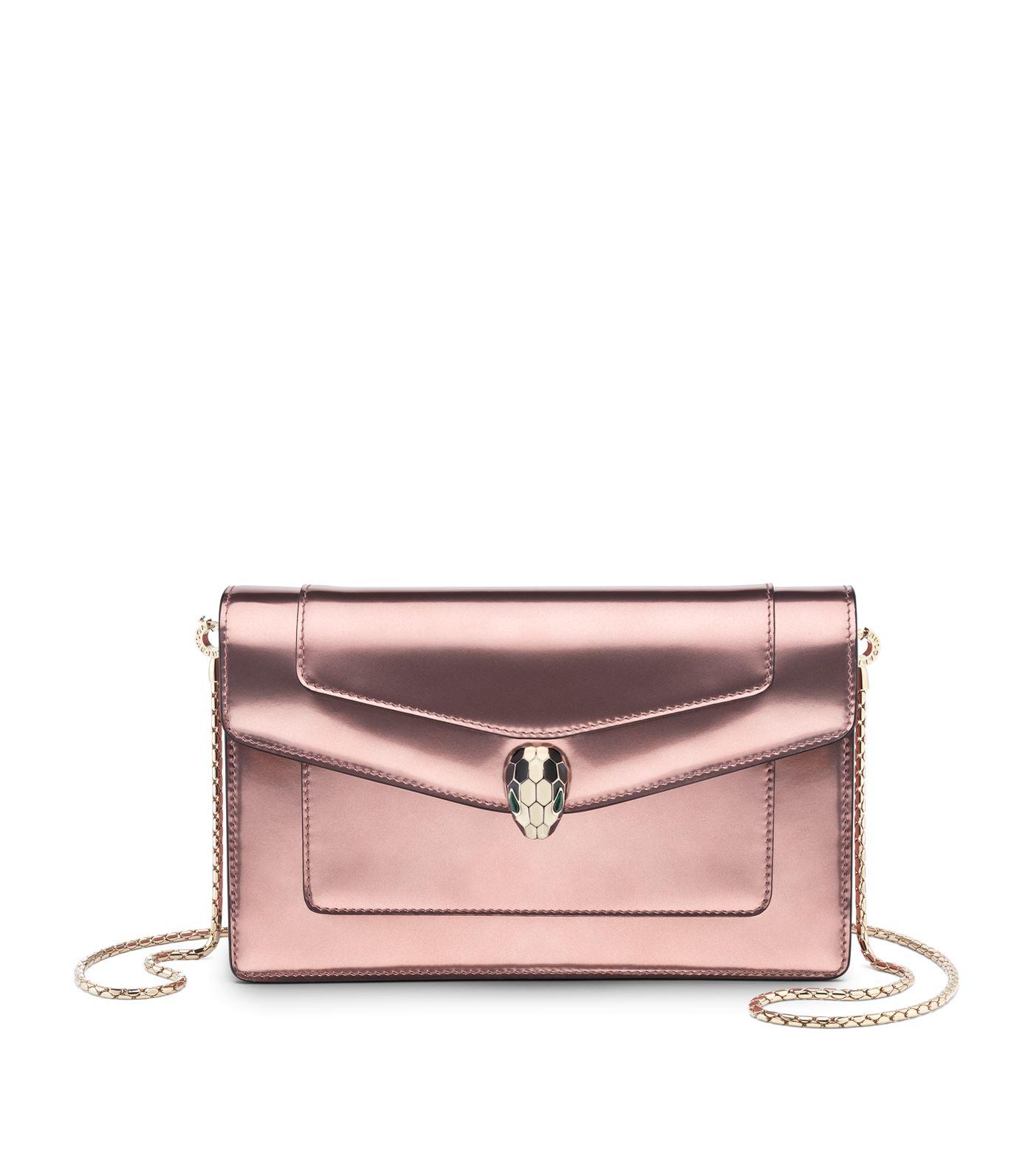 Go to HarrodsBvlgari - Bulgari's Serpenti Forever collection is inspired by the history of humanity, dating back to ancient Greek and Roman mythology. A symbol of wisdom and vitality, the seductive serpent sits proudly upon the front flap of this pouch bag. Crafted in smooth metallic leather, the panelled design is suspended from a removable scale-effect chain strap, while the snake's precious green malachite eyes bring healing and positive energy to the wearer. Colour: pink