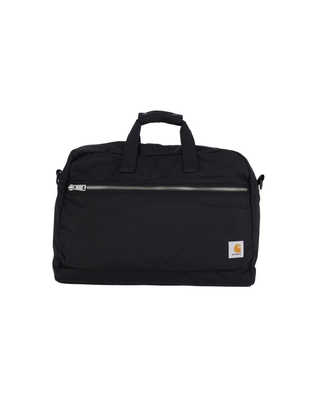 Duffel bag in black nylon with a structured rectangular silhouette. Features two top carry handles, a detachable and adjustable shoulder strap with buckle closure, a full-length silver-tone zipper opening on the top, and a front zippered pocket spanning the width of the bag. Interior is lined in black fabric with a quilted base and one internal zippered pocket. A webbing loop is visible on the back panel. Colour: black