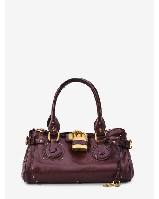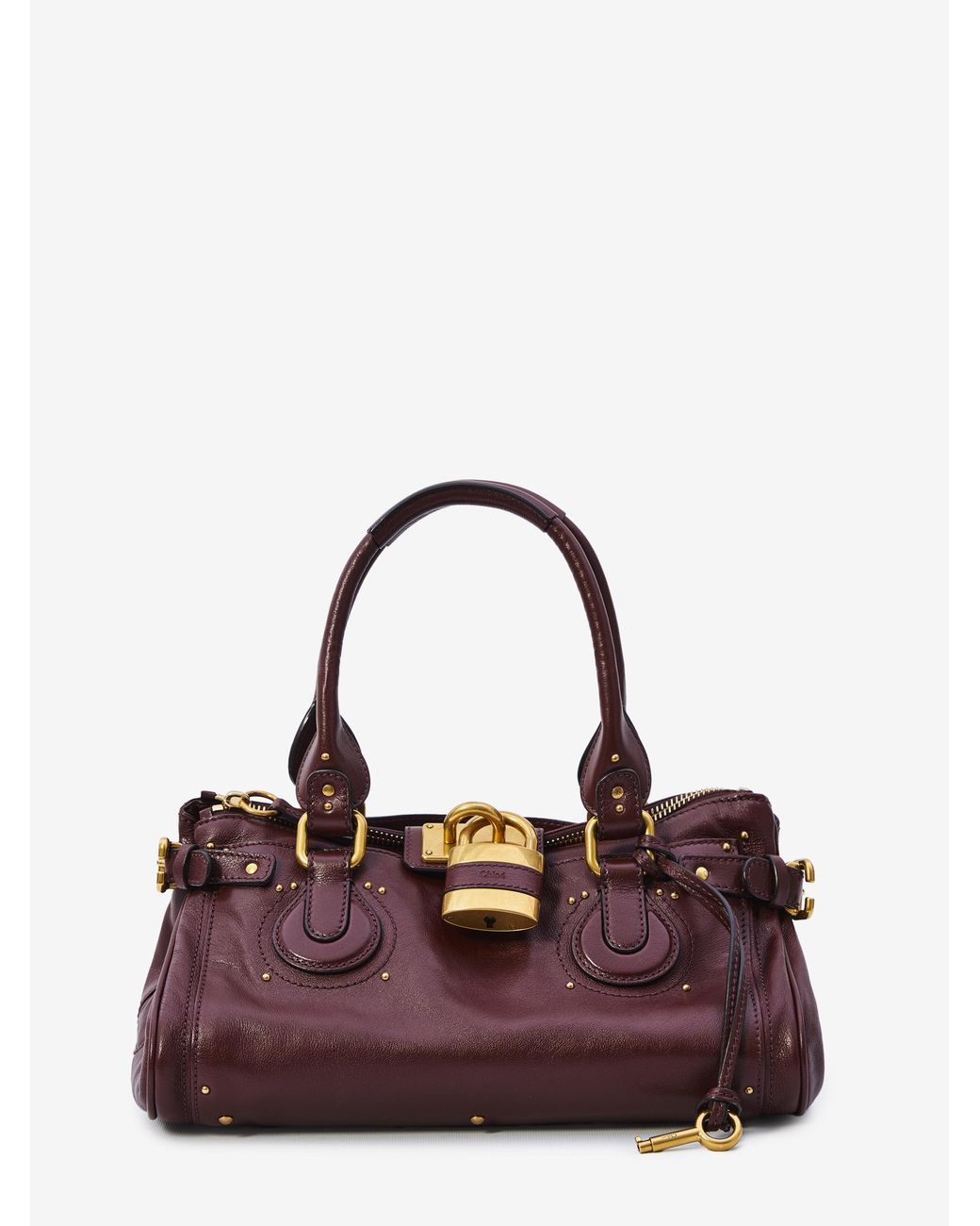 Bag in garnet Crafty brown buffalo leather. Features tubular top handles, oversized aluminum padlock, side straps with C-shaped buckles, two flat exterior pockets, zip closure, main compartment with a zip pocket, cotton lining, and metal feet. Dust bag included. Any slight irregularities in the leather are not to be considered defects, but rather a unique characteristic of the material.Dimensions: 36 x 18 x 18 cm Colour: purple