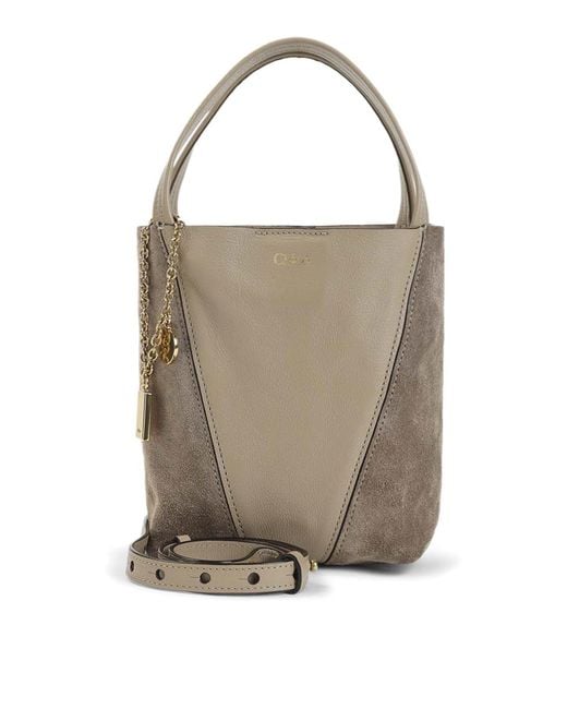 Chloe boyish brown buffalo leather spin bag. crafted in buffalo leather and calf leather. top handle, top fastening with gold-tone metallic ring, bucket design, front gold-tone lettering logo, adjustable and detachable shoulder strap, one main compartment, gold-tone hardware. side gold-tone metallic chain detail with metallic logoed plates. Colour: natural