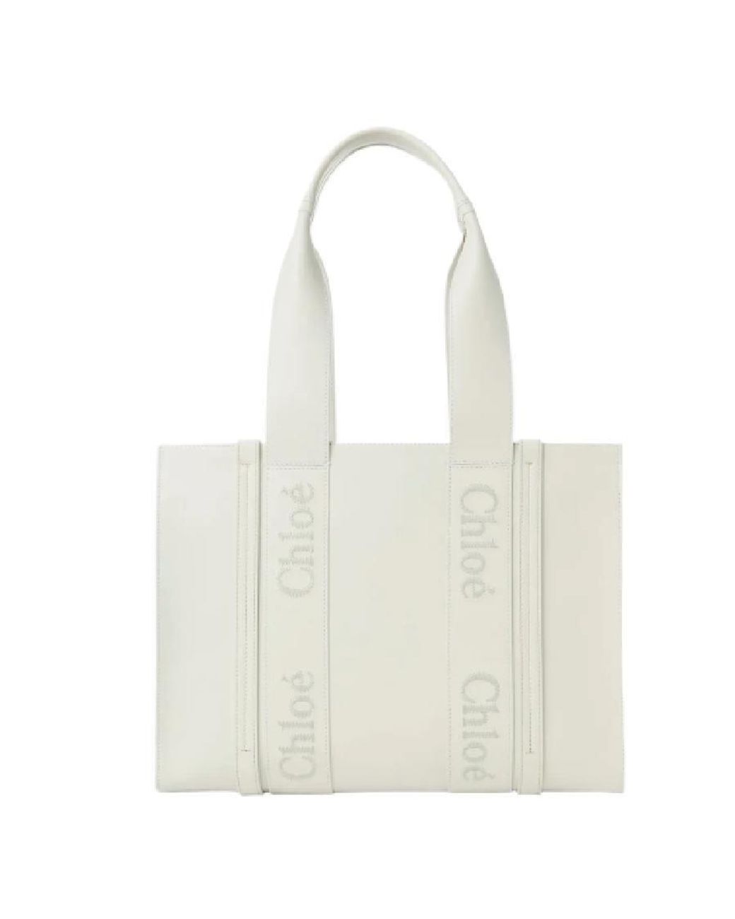 Chloe Ladies Tote. SKU: CHC22WS383I60101. Color: White. Size: W: 14.6 x H: 10.2 x D: 4.7. Chloe Woody Leather Logo Tote Bag. This Woody Tote Bag is made from smooth calfskin, offering a luxurious and natural look. It features a spacious main compartment with a practical flat pocket. The bags modern design is highlighted by vertical leather strips and the signature brands logo, which is revisited in tonal embroidery on calfskin. It can be comfortably carried on the shoulder. 100% Calfskin, 100% Linen. Made in Italy. Colour: white