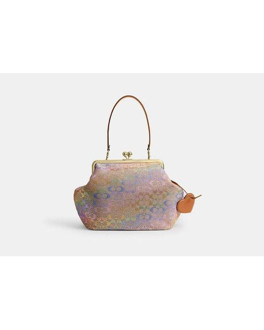 Our Large Kisslock Frame Bag is based on the “Cashin Carry” from 1969 an archival style designed by Coach’s first lead designer Bonnie Cashin. Reimagined as a spacious carryall it’s crafted of our smooth vachetta leather and shimmery crystal-embellished Signature jacquard in a bright rainbow ombré. Featuring our kisslock closure inspired by vintage coin purses an inside zip pocket to organise essentials and a crushworthy oversized heart charm it’s finished with a detachable shoulder strap. Our Signature Jacquard is made with a blend of 36% recycled polyester and 64% regenerative cotton sourced from farms that use regenerative agricultural practices—those that help to maintain and rejuvenate land increase biological diversity and soil health and could lead to increased carbon absorption. It reflects our ongoing commitment to helping reduce our impact on the planet. | Women's Large Kisslock Frame Bag in Crystal Jacquard Colour: black
