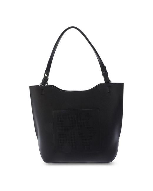 DKNY Toby Tote Bag in black silver. * Main compartment. * Magnetic fastening. * Inner zip compartment. * Interior pockets. * Perforated DKNY logo on the front pocket. * Ref: R52AAK84BSV Colour: black