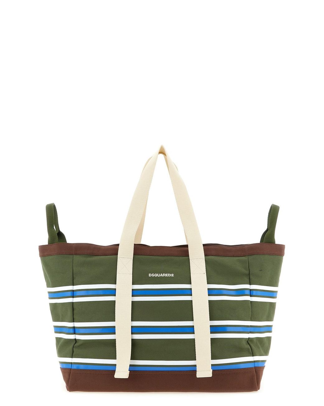 D2 College' striped cotton canvas shopping bag, double fixed handle, inside zip pocket, front logo embroidery. Composition: 100% cotton. Size&Fit: W 45 x H 37 x D 25 cm. Colour: white