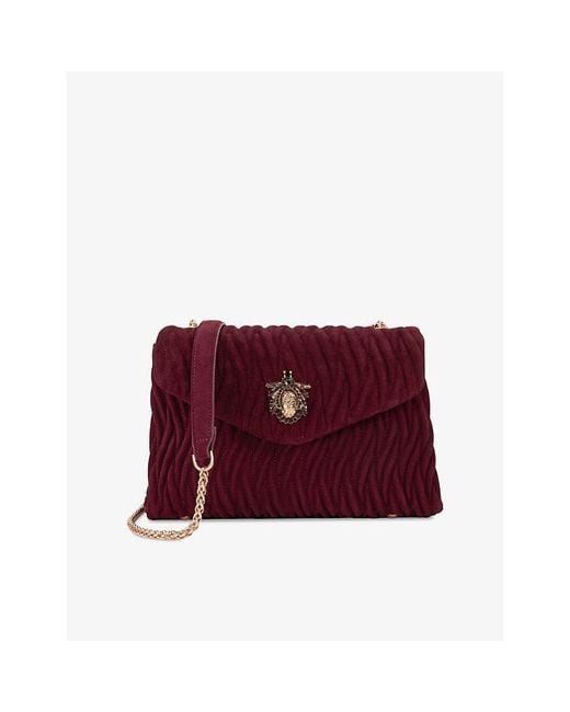 Dune suede bag100% suedeMagnetic fasteningChain shoulder strap, flap-over design with bug embellishment, one main compartment, gold-tone hardware, all-over quilted finishHeight 15cm, width 26cm, depth 7cm, handle drop 59cmSpecialist leather clean Colour: red