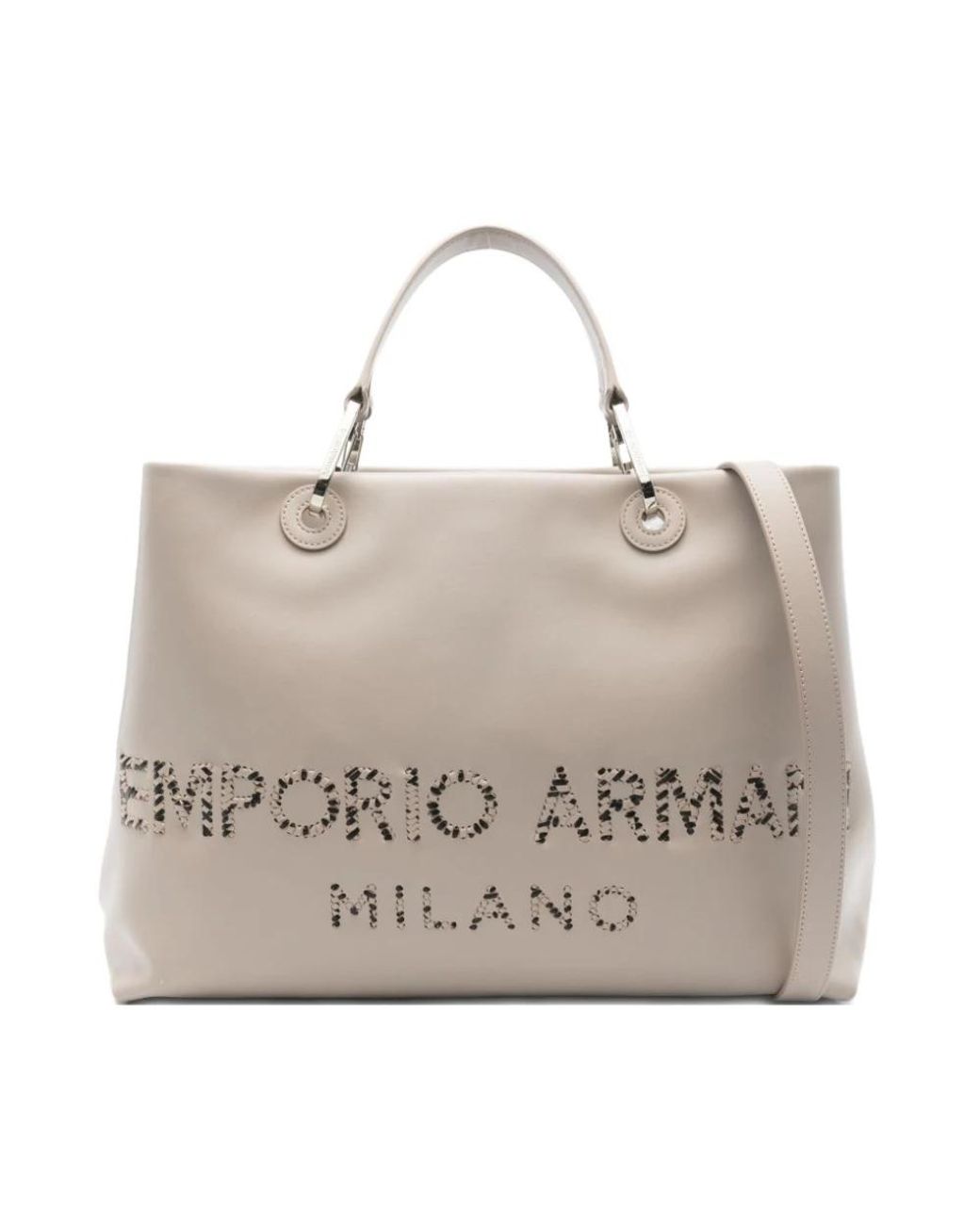 Emporio Armani Tote Bag with detachable top handles and a removable shoulder strap, designed for everyday carry and secure storage. Key attributes: Beige | Dove grey | Detachable top handles | Detachable shoulder strap | Internal zip-fastening pocket | Includes protective dust bag | Brown logo lettering Colour: grey
