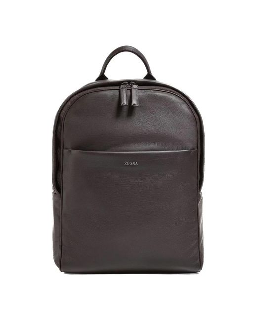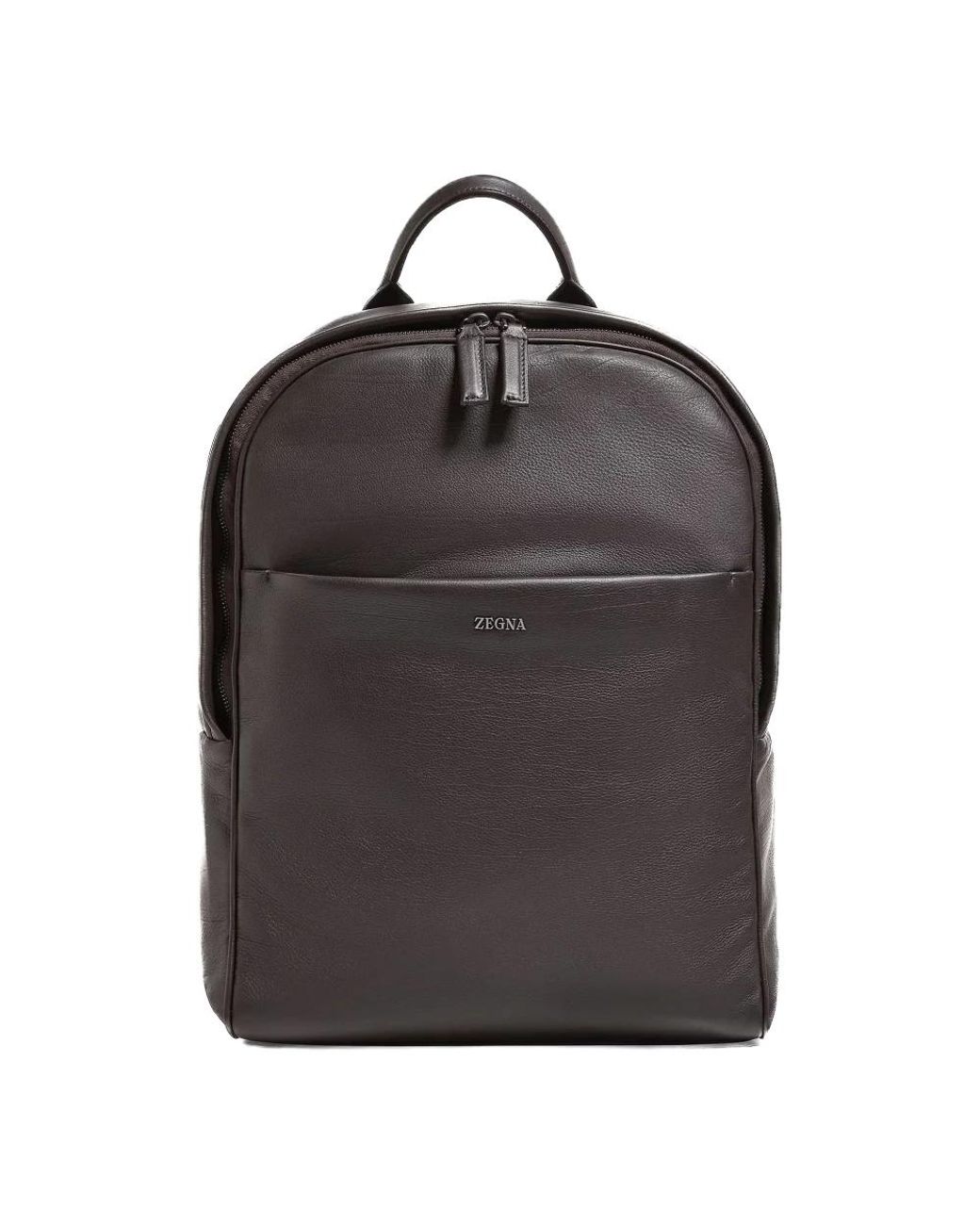 Crafted in a luxurious interpretation, this dark brown backpack is made of premium Second Skin leather by Zegna. The essential lines and understated elegance of the ultrablack metal details enhance the extraordinary softness of the construction, while the black polyester lining carefully protects personal effects. Adorned with the metal Zegna logo on the front and the iconic 232 Road Brand Mark in leather on the back, the model closes with a zipper and embodies a perfect balance between functionality and timeless style. Dimensions: 45 x 30 x 15 cm. Colour: black