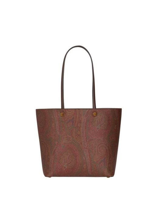 Medium ETRO Essential tote bag in iconic Paisley jacquard fabric, with leather details and lining. Embellished with raised Pegaso symbol and ETRO logo. This item comes with a removable inner clutch. Colour: brown