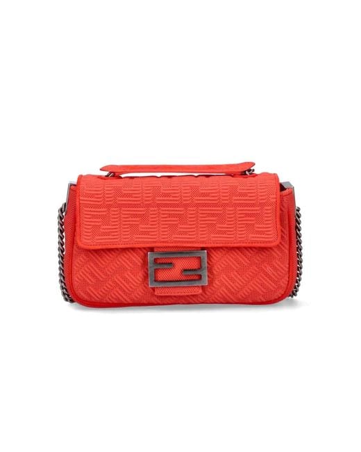 Fendi 'Baguette Chain' Midi Bag, orange technical mesh with three-dimensional FF pattern, chain shoulder strap, magnetic FF closure and front flap, main compartment, inside pocket, metal details. - 92% polyamide, 8% elastane - 14.5 x 24 x 7 cm - made in Italy - 8BR793 AHW5-F1F2I Colour: red