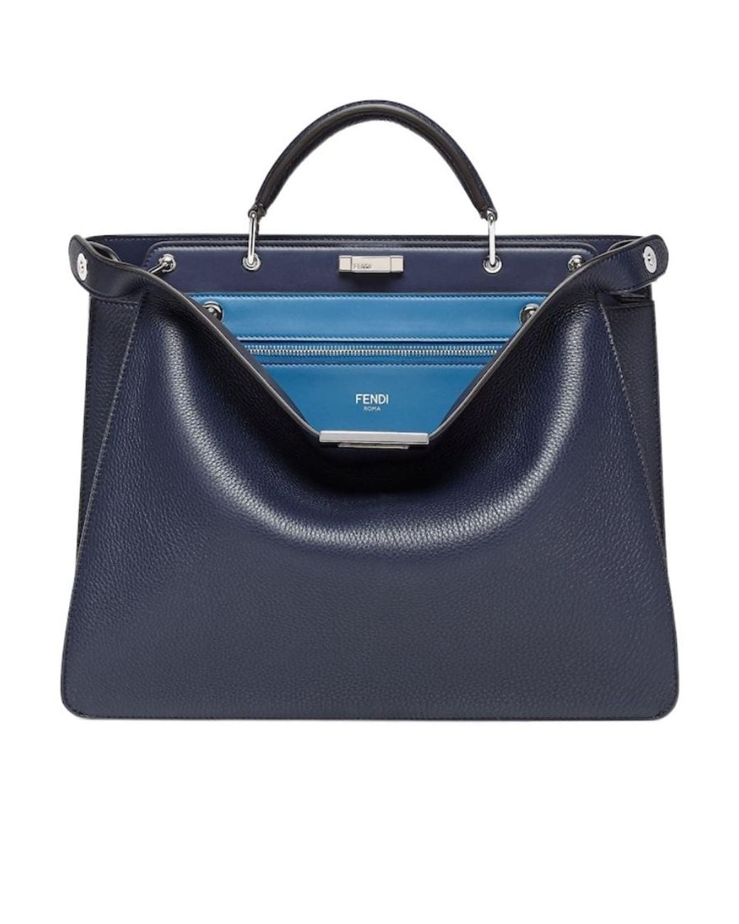 Dark blue. The interior is equipped with two hard partition layers, the front is equipped with classic twist lock, and the back is opened and closed with zipper. The detachable inner bag is made of light blue leather on one side and FF cloth on the other. Silver facing metal parts. Equipped with handle and adjustable detachable shoulder strap, which can be carried by hand or shoulder. Colour: blue