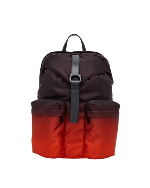 Brand: Ferragamo. SKU: 241328 764769. Color: Blue. Ferragamo Adjustable Strap Gancio Backpack. This backpack features a top flap with a magnetic clasp and a leather strap with a metal Gancio. Under the flap, a drawstring puller tightens the opening. It also has two front pockets, a padded back made from breathable fabric with a hidden pocket, and adjustable, padded shoulder straps. Composition: fabric and calfskin. Made in Italy. Colour: red