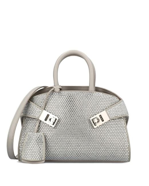 Silver crystal embellishment gancini buckle two leather top handles detachable adjustable shoulder strap wraparound sides Size: One Size. Gender: Female. Material:Calf Leather. Colour: grey