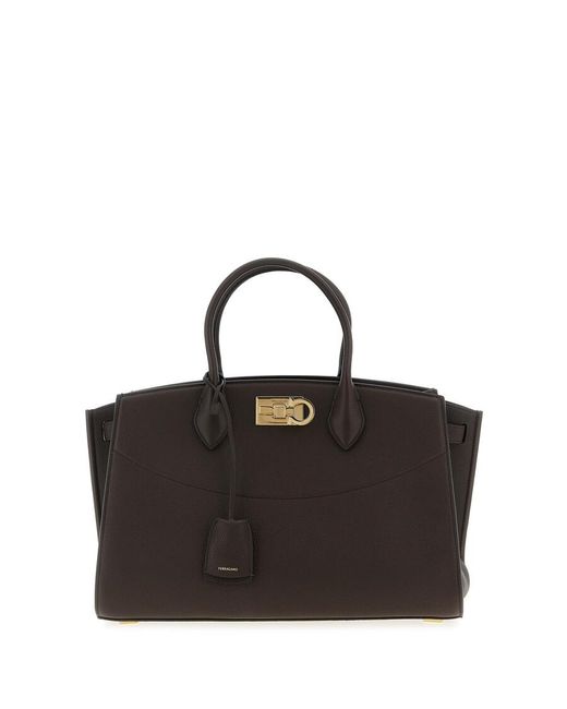 Ferragamo Ladies Tote. SKU: 785996TESTADIMORO. Color: Brown. New Ferragamo Studio Soft (L) Handbag. New Ferragamo Studio Soft (L) hammered calf leather handbag, Gancini slider metal buckle closure, adjustable side gussets, double fixed handle, rigid base with metal feet, adjustable and removable shoulder strap, removable keyring. Composition: 100% calfskin leather (Bos Taurus). Colour: black