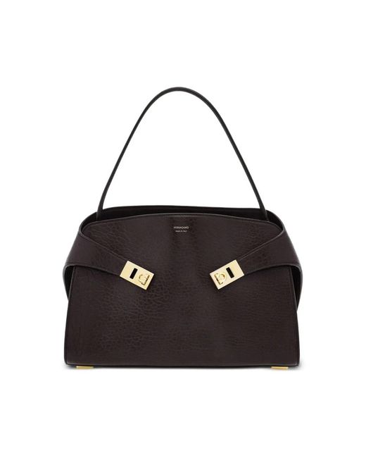 Ferragamo tote bag in textured brown leather, finished with signature Gancini buckles in gold-tone and a secure central zip closure. Key attributes: Brown | Leather | Top handle | Central zip closure | Textured leather | Gancini buckles | Gold-tone hardware | Dimensions & fit: Depth: 15.5 centimetres | Height: 25.5 centimetres | Width: 34.0 centimetres | Composition & care: Leather | Wipe clean with a soft cloth. Avoid prolonged exposure to water and direct heat. Professional leather cleaning recommended. Colour: black