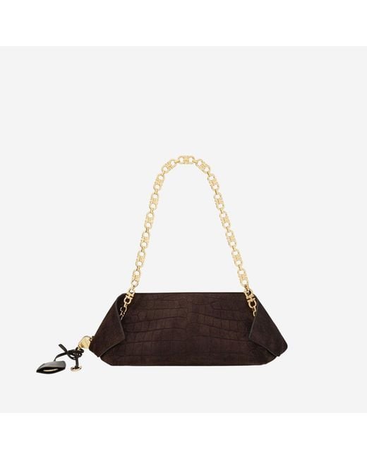 Shoulder bag made of suede leather Metal chain handles Double slider zip closure Logo detail on the front Personalized charm with key ring and ring Lined interior All-over animal print Dark brown Made in Italy Composition: 100% suede leather