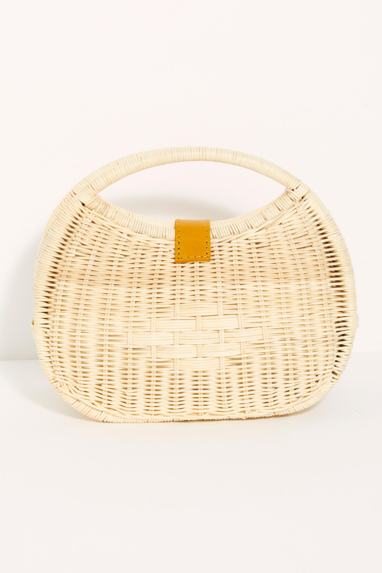 Go to Free PeopleWoven wicker clutch featuring leather details and structured top handles. Lined interior with slip pocket. Centre opening. Button closure. Import. Height: 8.5 in. Width: 12 in. Depth: 5 in. Leather. Rattan. Colour: white