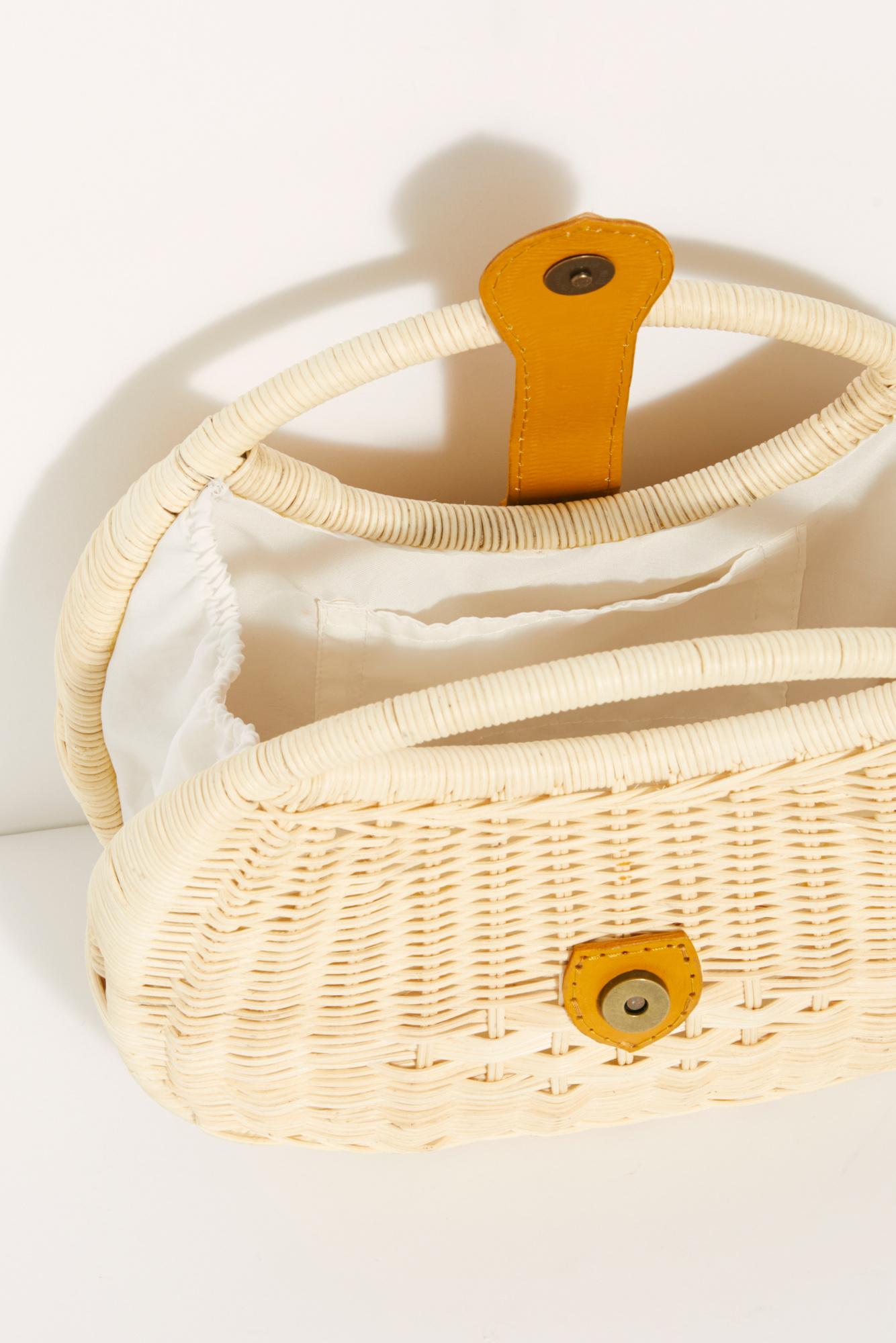Woven wicker clutch featuring leather details and structured top handles. Lined interior with slip pocket center opening button closure.