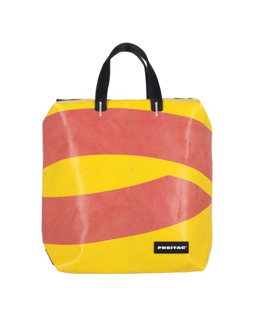 Red Freitag F201 backpack - made of recycled PVC - with grey details, two top handles, adjustable shoulder straps, black logo application on the front, a back zip pocket, and three internal compartments. - product made from recycled materials Colour: yellow