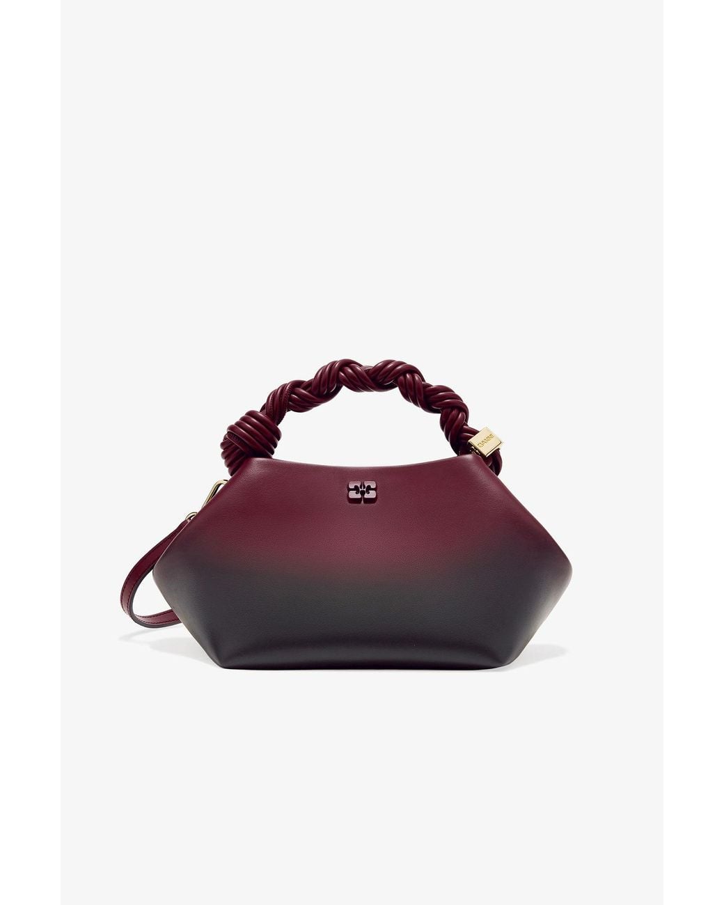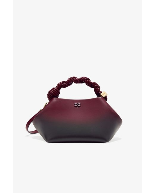 This bag features a tone-on-tone metallic GANNI Butterfly logo, a twisted handle with a braided knot, and a gold-tone metallic dice with a GANNI Butterfly logo engraved. The bag has an internal magnetic closure, a flat card pocket inside, and an adjustable and removable shoulder strap for crossbody wear. Made for women, it's available in one size and comes in a red color.