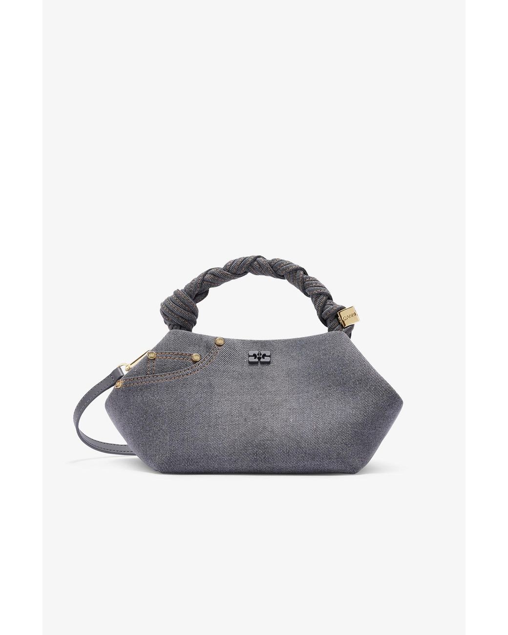 This Ganni bag features a tone-on-tone metallic GANNI Butterfly logo, a twisted handle with a braided knot, and a metallic dice with a GANNI Butterfly logo engraved. The bag has an internal magnetic closure, a flat card pocket inside, and an adjustable and removable shoulder strap for crossbody wear. It is available in a grey colour and comes in a one-size fit. Perfect for everyday use, this bag is designed for women. Colour: grey