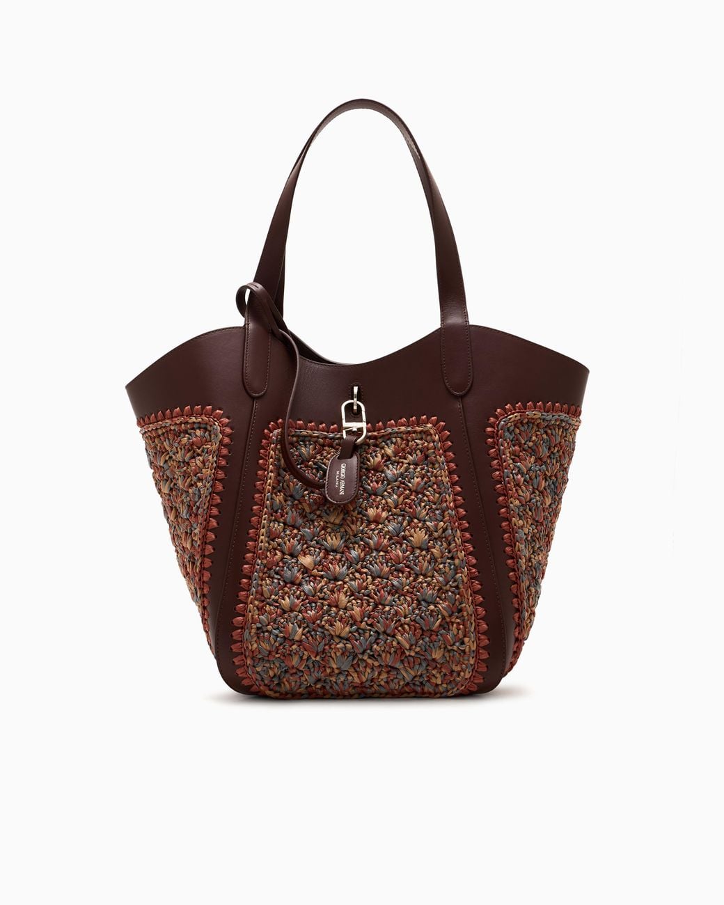 Medium handbag made of calfskin leather and featuring inserts made of fan-stitch raffia, a special artisanal construction that adds value and sophistication to the accessory. The style combines a square shape with a deconstructed, unlined construction with a draped look. Featuring a distinctive metal ring and snap-hook closure, it is embellished with a practical zipped, detachable internal pouch perfect for your mobile phone. A versatile, feminine offering, designed for everyday use, perfectly in keeping with the ready-to-wear colours and inspirations. Colour: brown