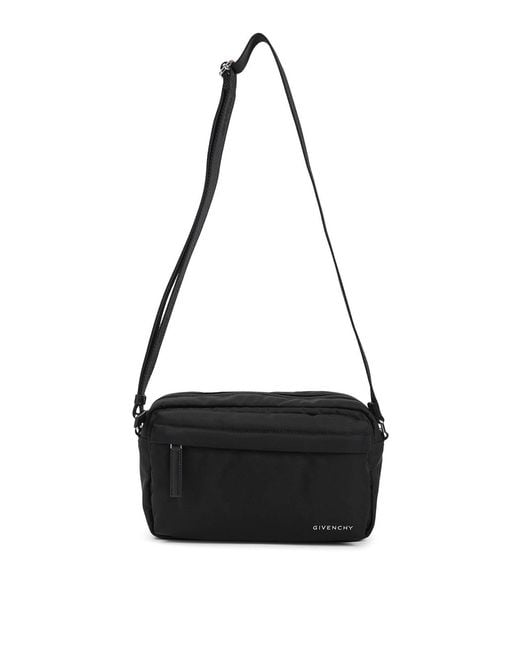 Givenchy voyou medium black polyamide shoulder bag. crafted from black nylon, featuring a zip fastening with leather zipper pull, an adjustable web strap for crossbody carry, silver-toned hardware, metal givenchy signature on the front. it includes a zipped front pocket, and one flat back pocket. Colour: black