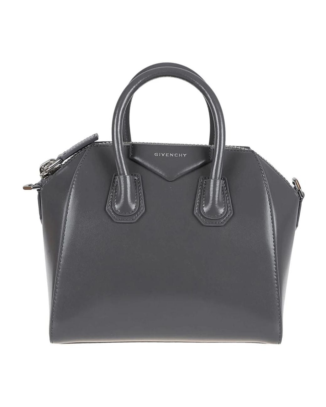 Givenchy Mini Antigona Bag is a compact box-calfskin handbag designed for top-handle or crossbody wear. It highlights a pentagonal logo appliqué and a zipped closure for secure everyday carry. Key attributes: Grey | Grey | Box calfskin leather | Zipped closure | Leather handles | Adjustable and removable leather shoulder strap | One main compartment | Two flat pockets and one zip pocket inside | Pentagonal appliqué with silver-embossed Givenchy signature | Antigona silhouette | Box-shaped construction | Dimensions & fit: 8.7 in x 7.9 in x 5.1 in | Strap length min: 17.1 in | Strap length max: 21.7 in | Mini size | Composition & care: 100% calfskin leather | Store in original packaging in a dry place. Avoid exposure to moisture, heat, direct light, water, perfumes, cosmetics or other liquids. Clean with a soft, slightly damp cloth and allow to air dry. Colour: black
