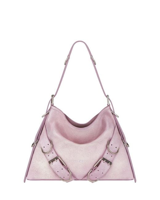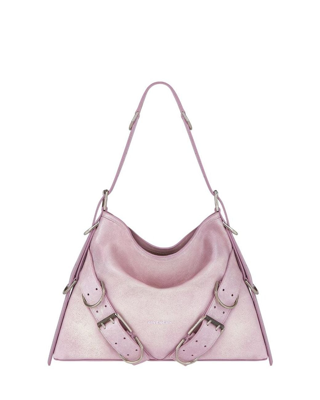V-shaped profile, adjustable shoulder straps, portable, shoulder back or oblique slung, metal clasp, silver finish metal details, the front of the package is decorated with LOGO, a main compartment and an internal zipper pocket. Lining: 90% cotton, 10% polyester. Metal parts: 100% brass. Colour: pink