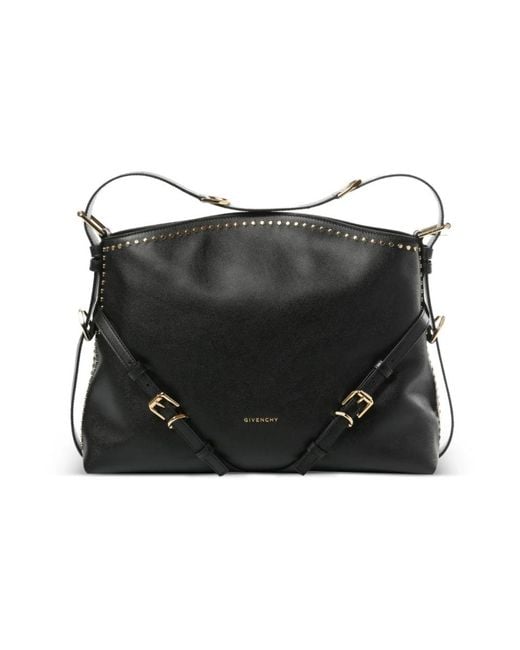 Givenchy Voyou Medium Bag combines a V-shaped slouchy silhouette with studded calfskin leather for generous everyday carry. The adjustable strap offers hand, shoulder or crossbody wear for versatile use. Key attributes: Black | Calfskin leather | Adjustable shoulder strap | One main compartment | Interior zipped pocket | V-shaped slouchy silhouette | Stud detailing | Givenchy embossed logo | Golden-finish metal hardware | Suede lining | Dimensions & fit: 15 in x 12.2 in x 3.9 in | Strap length: Min 9.8 in | Max 21.7 in | Medium size | Adjustable strap allows hand, shoulder or crossbody carry. | Composition & care: 100% calfskin leather Colour: black