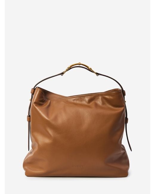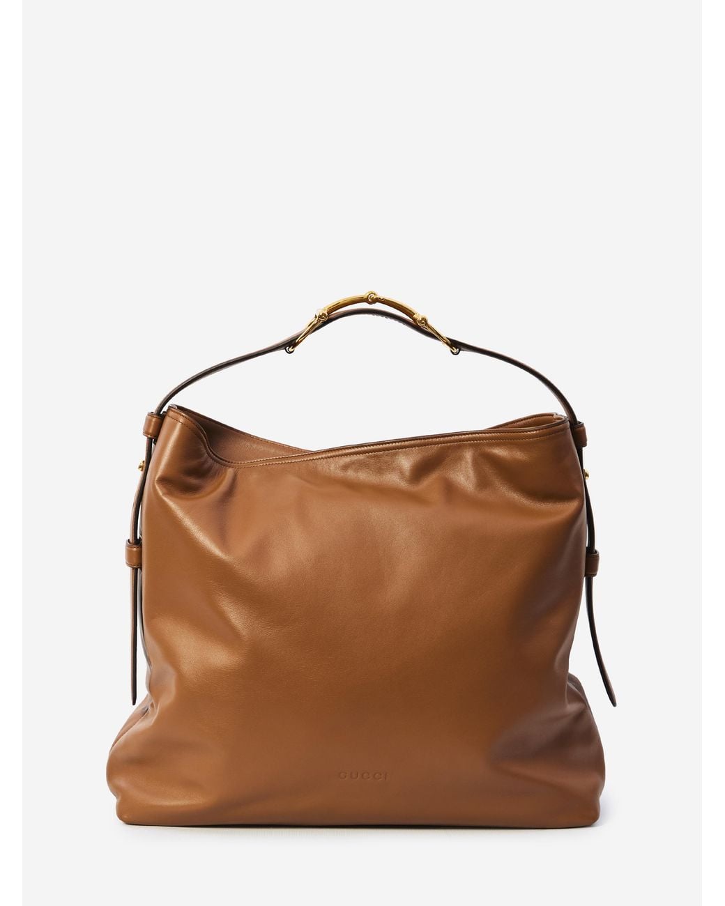 Camel soft leather bag. Features a smooth leather top handle with adjustable length and a gold-toned Horsebit detail, magnetic closure, one main compartment with a zip pocket, and brown cotton-linen lining. Dustbag included. Any imperfections in the leather should not be considered manufacturing defects, but rather a characteristic of the material.Dimensions: 40 x 36 x 12 cm Colour: brown