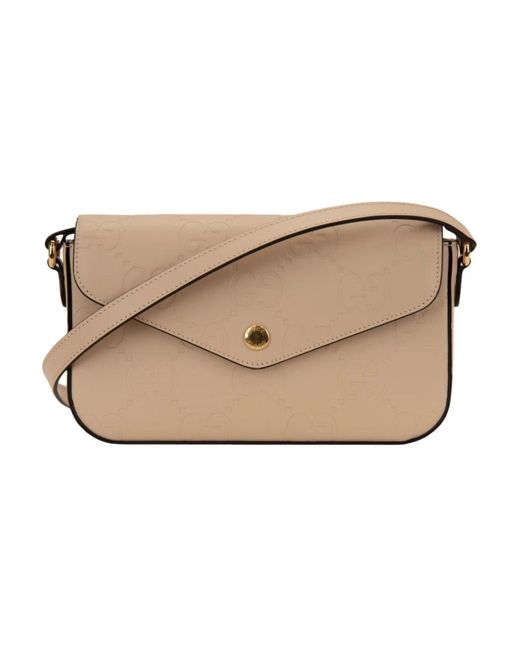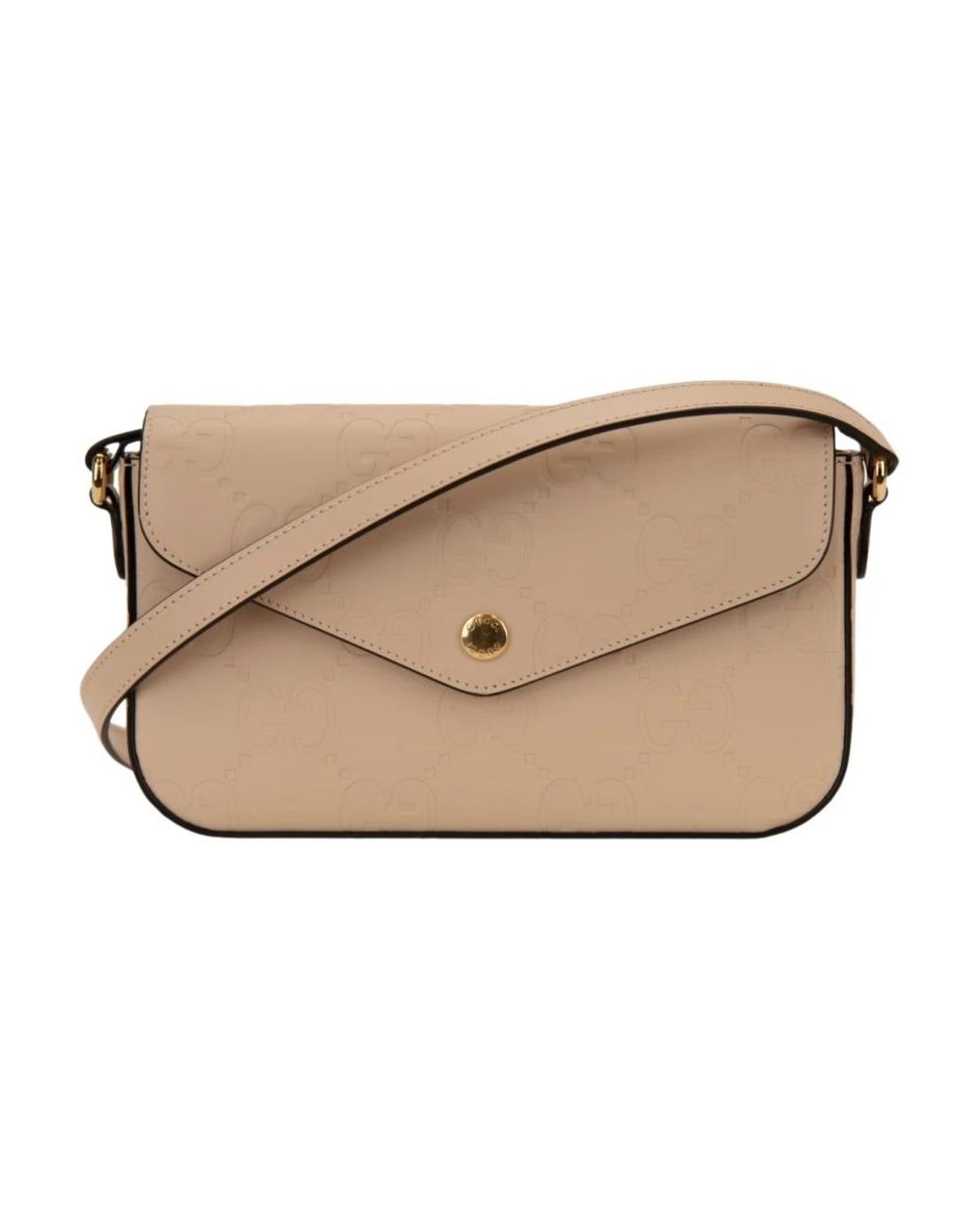 Gucci shoulder bag with an embossed 'Gg' leather exterior and magnetic button closure, designed for everyday crossbody use. Key attributes: Pink | Rosa | Leather | Adjustable shoulder strap (non-removable) | Magnetic button closure | Spacious interior with leather side pocket | Fabric-lined interior | Embossed 'Gg' motif | Engraved brand logo on interior pocket | Dimensions & fit: Width: 21.5cm | Height: 12.5cm | Depth: 3.5cm | Composition & care: Leather | Fabric lining Colour: natural