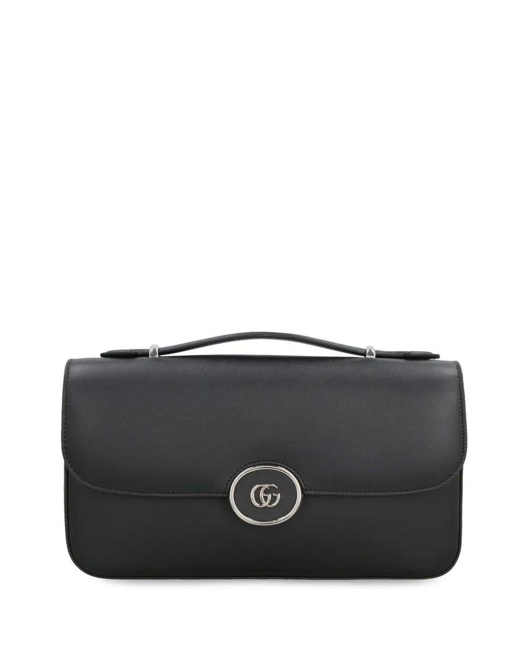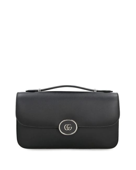 Foldover-top leather shoulder bag from Gucci featuring black, leather, silver-tone hardware, signature Interlocking G logo plaque, foldover top, single top handle, chain-link shoulder strap, main compartment and internal zip-fastening pocket.