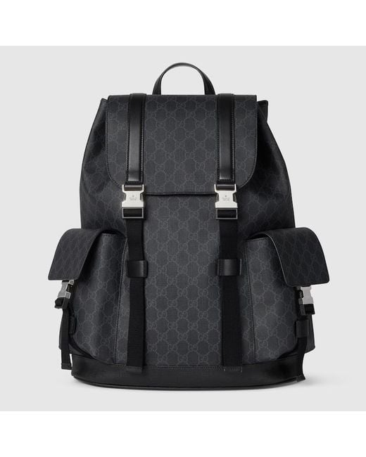 The signature GG Supreme canvas remains an evergreen of the House thanks to its soft and malleable qualities. Crafted from a coated microfiber fabric, here it appears in an all black variation to define this backpack. A tonal leather trim completes the style, while a pop of colour appears in the form of the archival Web stripe. Black GG Supreme canvas, Black leather trim, Blue and red Web, Cotton linen lining, Padded mesh back, Canvas shoulder straps, Two side pockets with buckle closure, Inside Colour: black