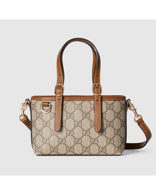 The GG Emblem collection introduces contemporary silhouettes in the women's small leathergoods, ideal for carrying daily essentials. This beige and brown mini bag is crafted from the GG Monogram coated fabric. Featuring a brown leather trim, the design comes with a detachable and adjustable leather shoulder strap. Beige and brown GG Monogram coated fabric, Brown leather trim, Palladium-toned hardware, Green and red Web cotton lining, Additional D-ring for detachable items, Adjustable leather han Colour: metallic