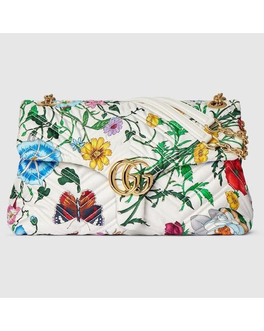 Introducing Spring Summer 2026. This GG Marmont shoulder bag highlights one of the House's signature styles in vivid colours. Crafted from Flora-motif silk twill, it is complete with gold-toned hardware. White and multicolour Flora silk twill, Gold-toned hardware, Light pink silk satin lining, Double G, Inside: zip pocket, Outside: open back pocket, Sliding chain shoulder strap: 28 - 51cm drop, Magnetic closure, W31cm x H17cm x D8cm, Weight: approximately 0.5kg, Made in Italy, Fits iPhone Pro Max/ Colour: blue