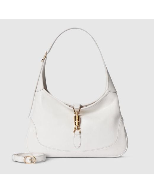 Introducing Spring Summer 2026. This new Gucci Jackie 1961 presents a sleek style, crafted from soft grainy leather that has been carefully aged by hand to create a time-worn, vintage-inspired effect. It is complete with an easy-to-use piston closure, further elevating one of the House's most signature hardware details in gold-toned finish. White soft grainy leather with natural glossy finish, aged by hand for a time-worn, vintage-inspired effect, Gold-toned hardware, Light beige nappa leather l Colour: white