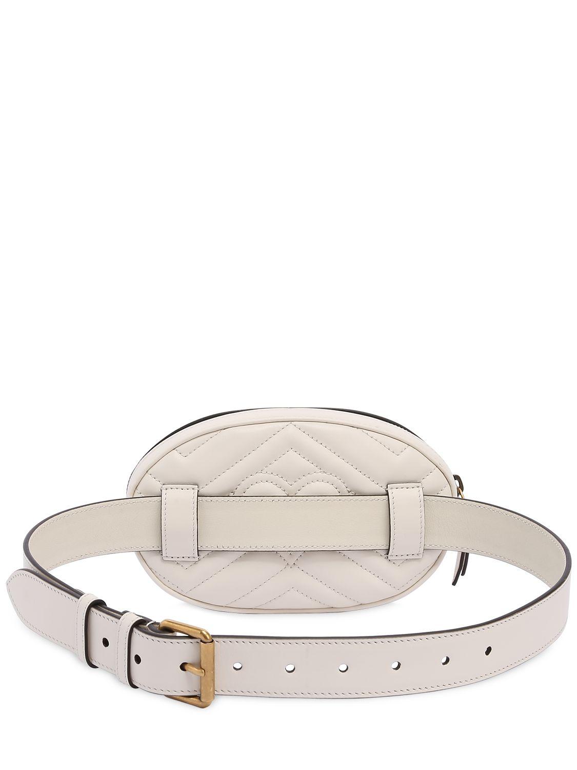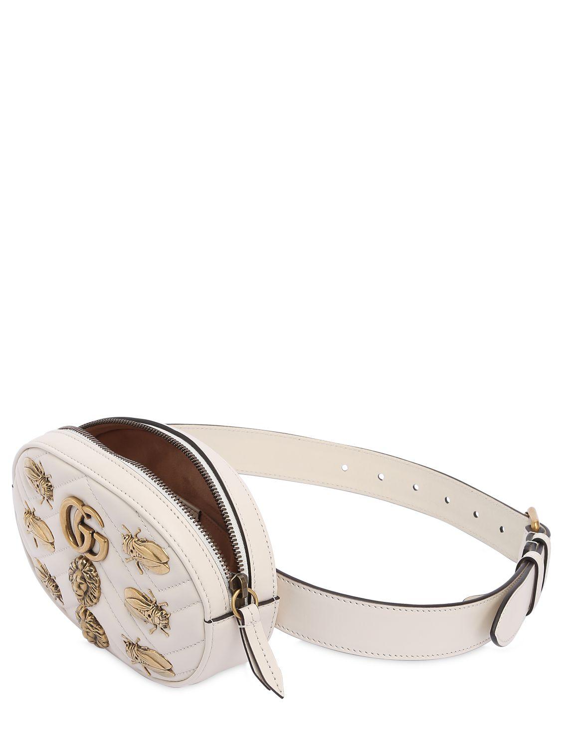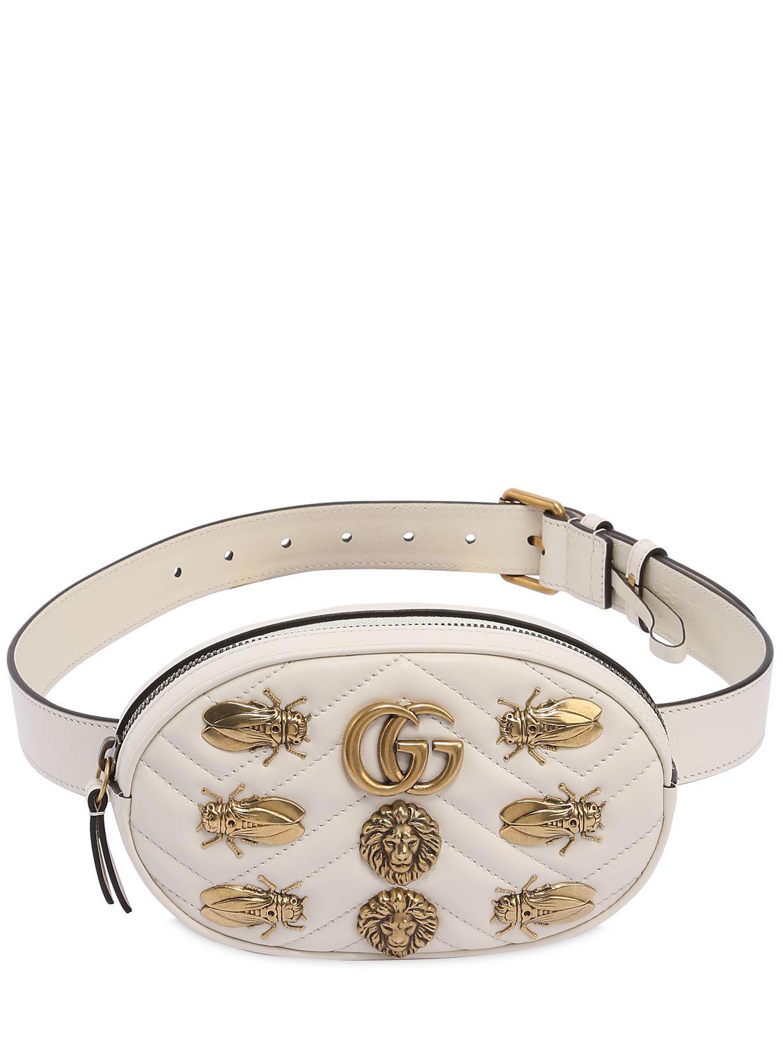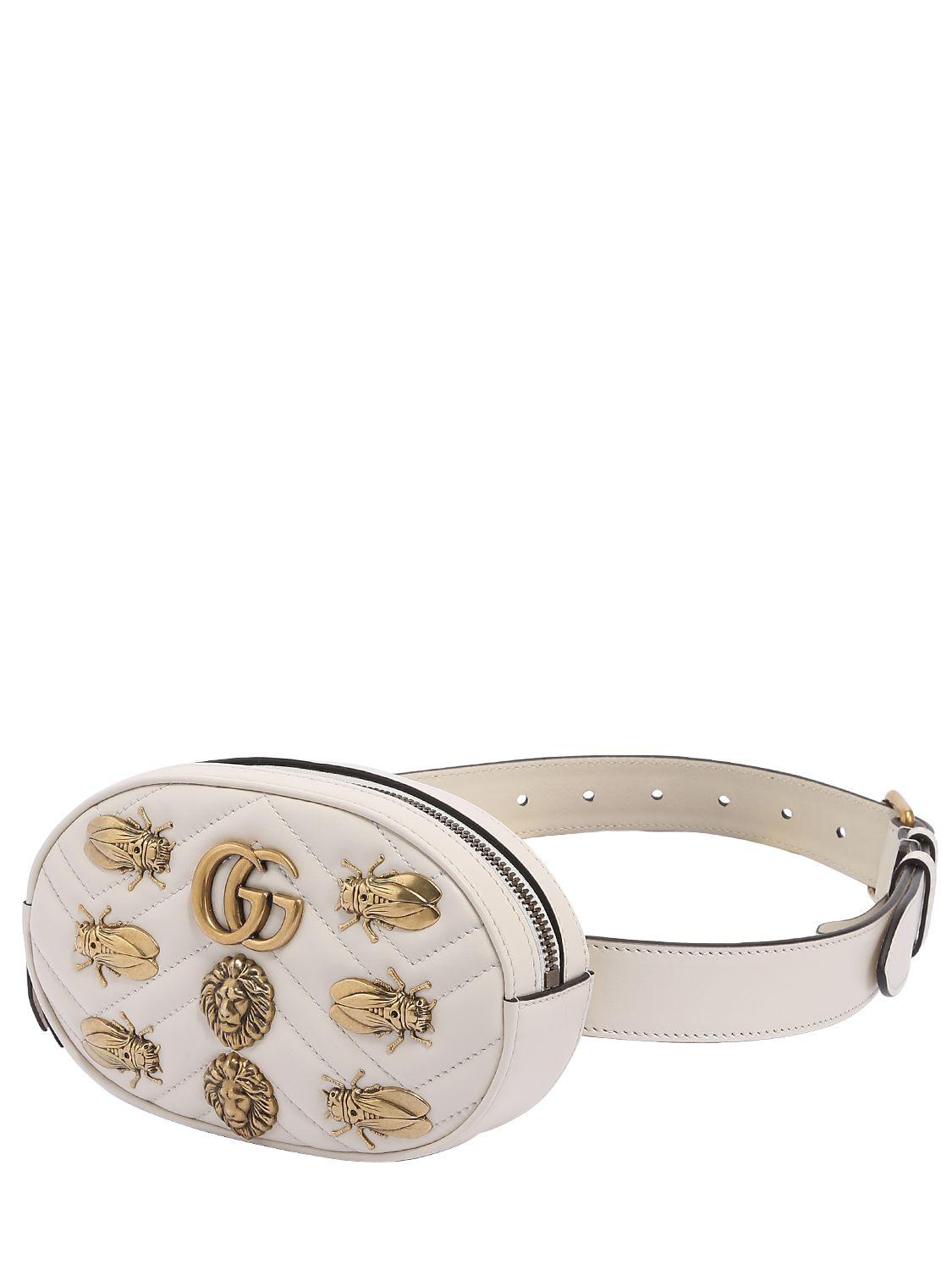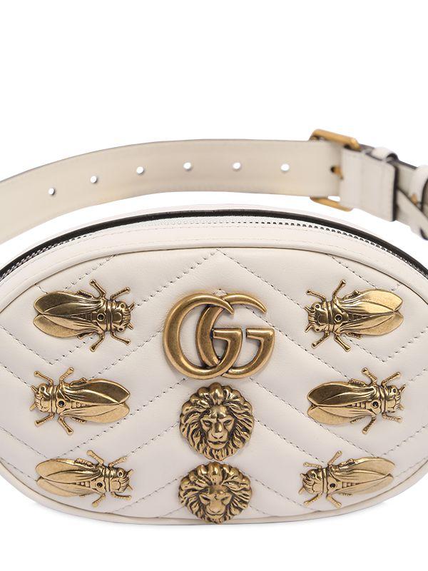 Height: 11cm Width: 18cm Depth: 5cm. Adjustable buckle closure. Zip closure. Quilted front panel. Metal appliqués on front. Metal logo detail. One internal patch pocket. Colour: white