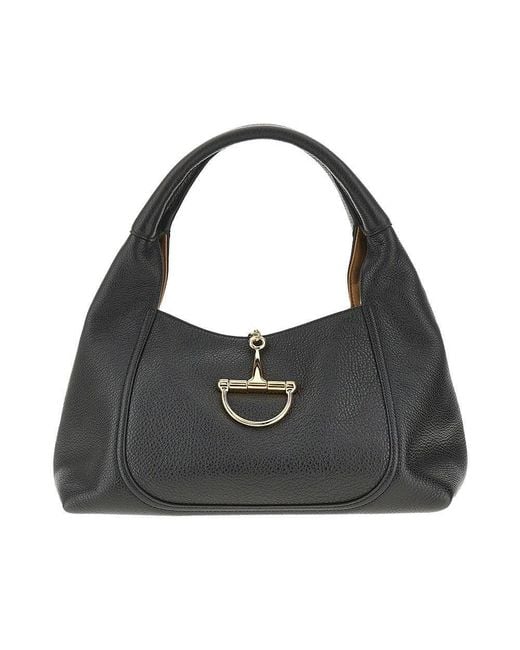 Bag made from grained leather, featuring joint magnetic closure with signature gold-finished metal half Horsebit detail. Tubular double handle to carry by hand or on the shoulder. Suede leather lining equipped with one detachable matching pouch. Colour: black