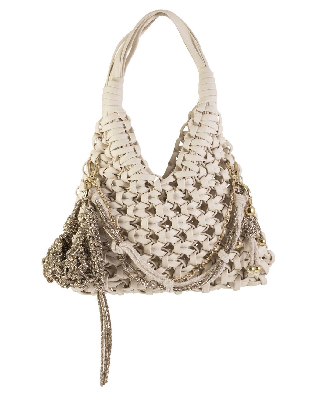 The Vannifique bag is the iconic accessory of the Hibourama collections. Entirely handmade using a sophisticated weaving technique, this bag blends day and evening wear, becoming a versatile accessory of great modernity and elegance. The model features precious crystals and pendants. - Made in Italy - Composition: 100% leather and crystals DESIGNER ID: VANNIFIQUE BUTTER WHITESpecificationValueYear2025SeasonFALL / WINTERMaterials100% Calfskin leatherColorWHITEColor CodeBUTTER WHITEMade InItalyMeasuresW 27 x H 36.5 x D 9 cmGenderWomenSize FormatOS Colour: natural
