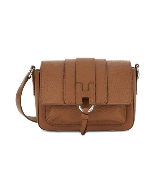 Hogan Trend Flap Bag is a compact leather crossbody that combines a flap silhouette with an embossed H detail and a versatile shoulder strap for everyday city use. Key attributes: Brown | Leather Brown | Leather | Flap with magnetic closure | Adjustable shoulder strap | Internal pocket | Flap silhouette | Embossed H logo | Metal hardware | Dimensions & fit: 7.9 x 4.7 x 3 ins | One size | Composition & care: Leather Colour: brown