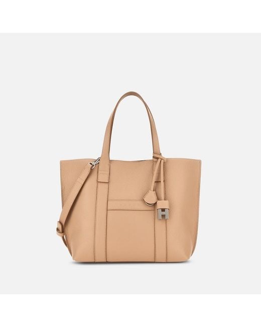 The Script shopping bag in a small size, with bands on the front to form a maxi H. Featuring two fixed handles and an adjustable, removable shoulder strap, this bag in hammered leather comes with a metal H-Fob charm and key holder pendant. The internal compartment, closed with magnetic button, features a wide central removable zipped pouch. Colour: natural
