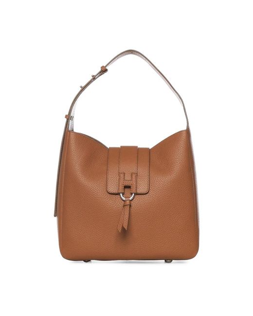 Hogan Trend Hobo is a compact calf-leather shoulder bag designed for everyday use. It features a flap closure with a magnetic button and an adjustable top handle for versatile wear. Key attributes: Brown | Calf leather | Flap with magnetic button closure | Adjustable top handle | Internal pocket | Flap-over design | Dimensions & fit: 28 x 29 x 9 cm | Composition & care: 100% Calf leather | Lining: 100% Polyester