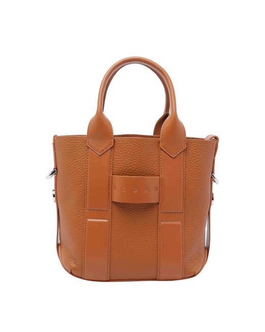 Hogan brown small hogan script handbag, clip closure, cardsholder, 2 handles, removable and adaptable strap, leather upper Colour: brown