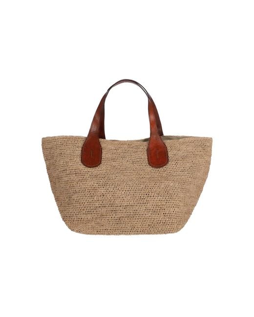 Large tote bag with an open-top silhouette constructed from crochet-woven raffia in natural beige. Two short top handles in tancognac-colored leather with stitched attachment panels. Interior features a beige fabric lining with multiple patch pockets, a zip pocket with orange zipper pull, and two silver-tone snap closures along the top edge. A small brown leather brand label is visible on the interior lining. Colour: brown