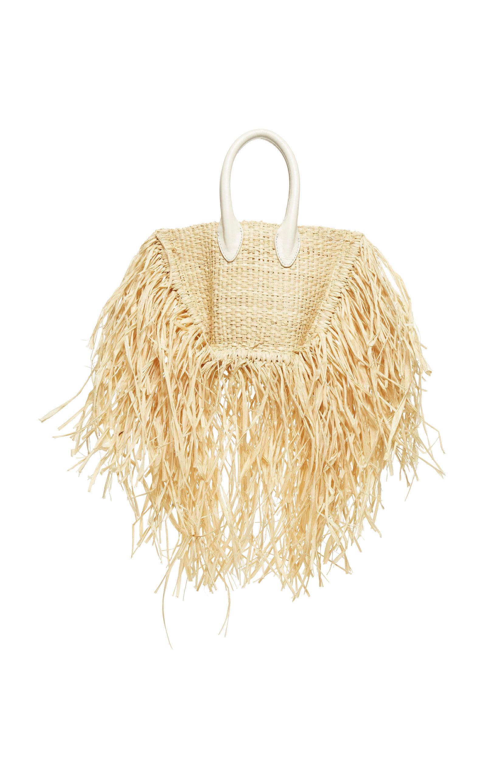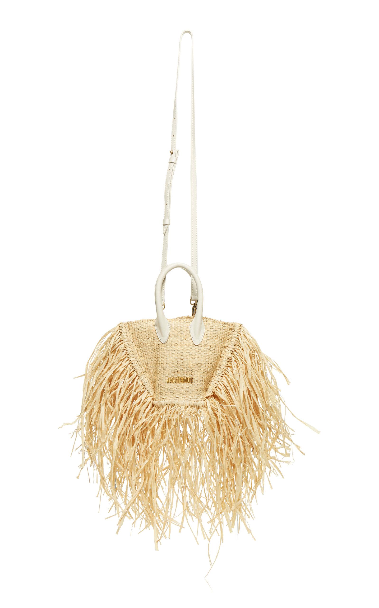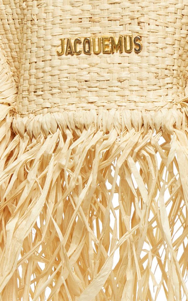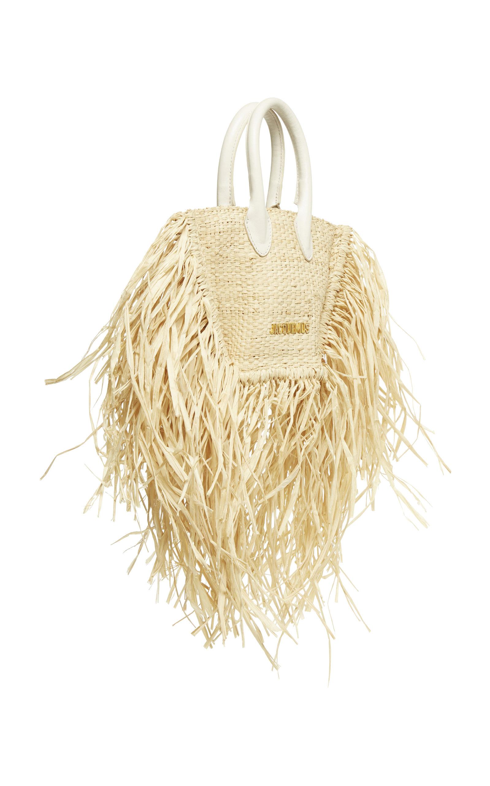 Go to Moda OperandiDesigned for your next warm-weather getaway, Jacquemus' 'Le Petit Baci' bag is woven and fringed in raffia. Consistent with the brand's popular sizing, the bag is featured in a micro-bag silhouette and includes a leather top handle. Style yours with a gauzy, light maxi dress for a complete look. Removable cross-body strap. Open top. Composition: 100% Raffia. Spot clean. Made in France.